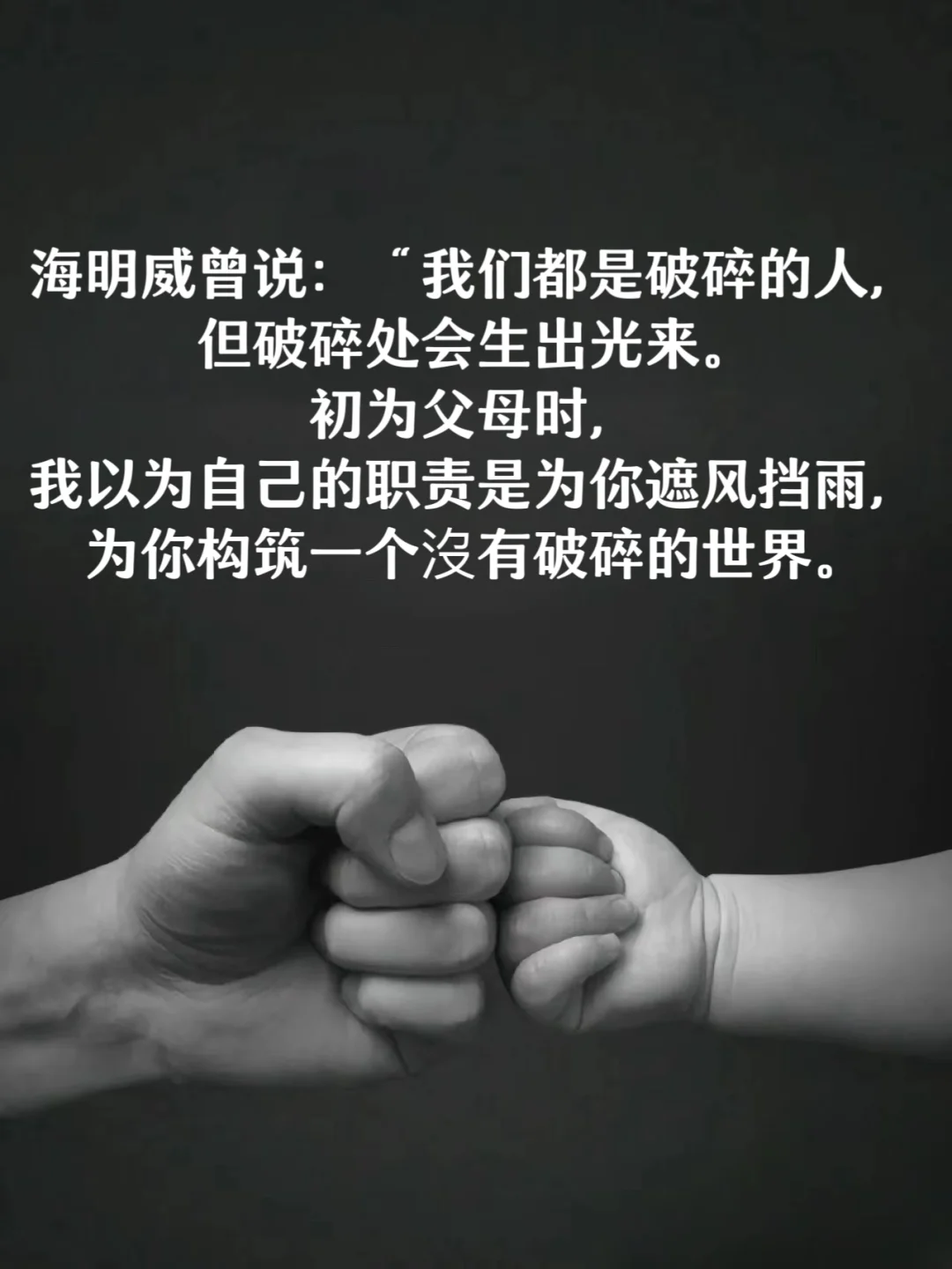 海明威曾说:“我们都是破碎的人,但破碎处会生出光来。初为父母时,我以为自己的职责是为你遮风挡雨,为你构筑一个沒有破碎的世界。