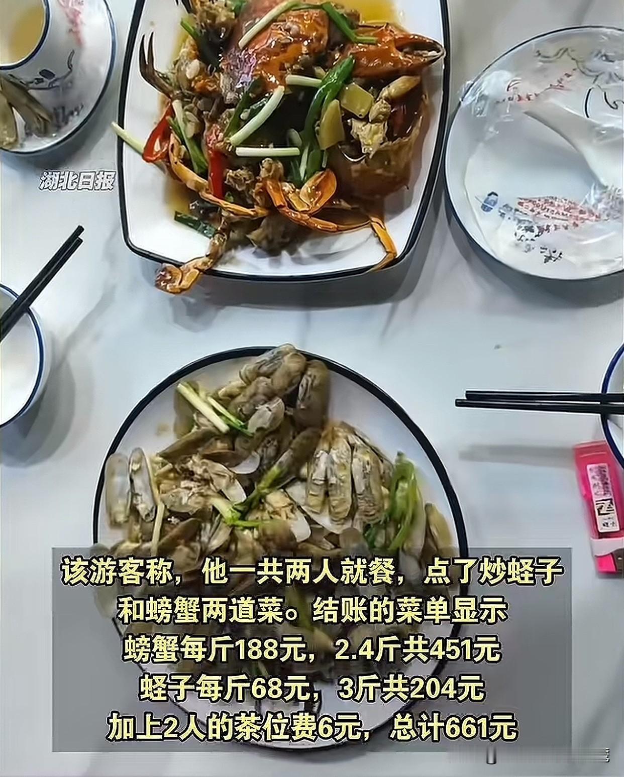 万万没想到!国庆期间一男子带家人去广东旅游,在海边点了一盘蛏子两只螃蟹,结账时居然要661块!男子当时都懵了。店家点菜时不说价格,光招呼着“先吃先吃”,这操作我真服了。 当时男子一家觉得在海边吃海鲜肯定不贵,看菜单没标价也没多想。等吃得美美的去结账,好家伙直接傻眼,要我说这价格也太离谱了。 说实话,我觉得这就是在欺负游客人生地不熟。趁着大家出门玩想着“来都来了”,先把生意做成了再说。但这么做生意真的长久吗?要我说,信任就像海鲜,不新鲜了谁还愿意来? 其实明码标价对大家都好,游客吃得安心,店家也能赚个长久钱。现在这样,搞得谁还敢去海边吃饭啊?大家评评理,是不是这个道理?