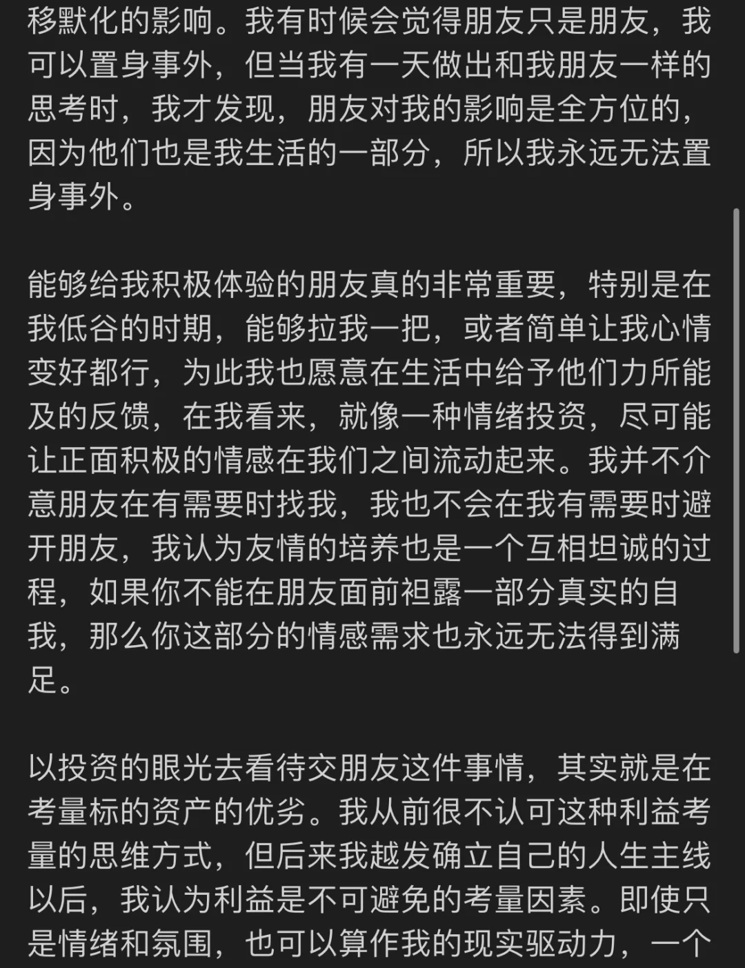 我认为正常人际交往是每个人的社会化需要,交朋友是不可避免的事情,总要有人能够在你需要情感或决策支持的时候满足你,向朋友暴露需求感并不是什么可耻的事情,只有你们互相袒露了彼此的需要,你们的那部分自我才能够被看见和满足,朋友的意义正是在于互相陪伴、互相发现。