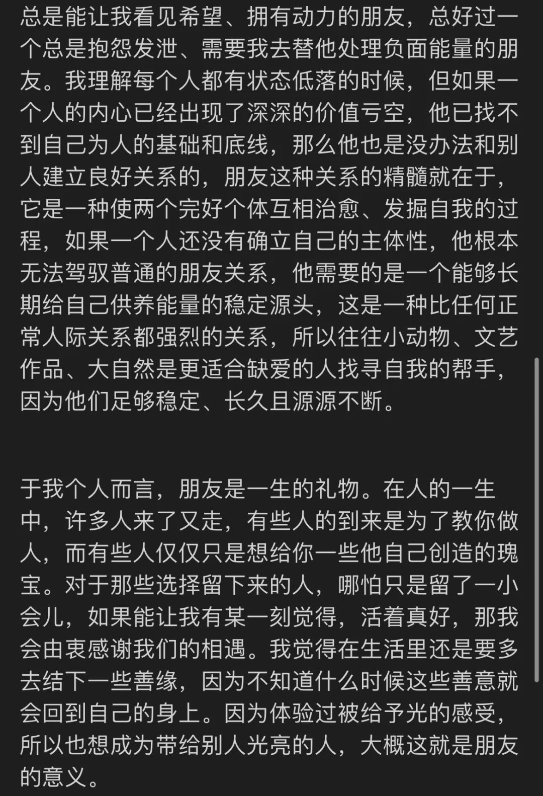 于我个人而言,朋友是持续一生的礼物。只要我还在生活着、经历着,我必然会遇到各种各样的人,我也会选择一些人进入我的生活。选择交往的朋友,就是选择一种生活,你必须面对他们给你的源源不断的反馈,你永远无法置身事外。所以尽量广结善缘,也尽量把握朋友的品质,学会去辨认一段关系,学会维持一段关系,也学会接受对关系的失望,和朋友的离去。因为体验过被给予光的感受,所以也想成为带给别人光亮的人,大概这就是朋友的意义。
