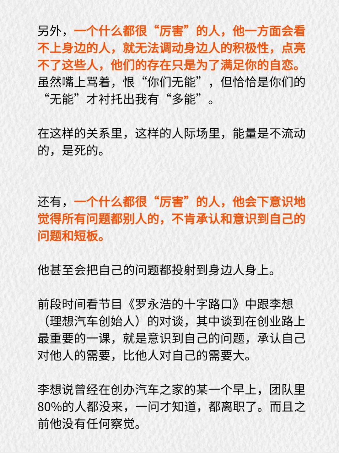 另外,一个什么都很“厉害”的人,他一方面会看不上身边的人,就无法调动身边人的积极性,点亮不了这些人,他们的存在只是为了满足你的自恋。虽然嘴上骂着,恨“你们无能”,但恰恰是你们的“无能”才衬托出我有“多能”。