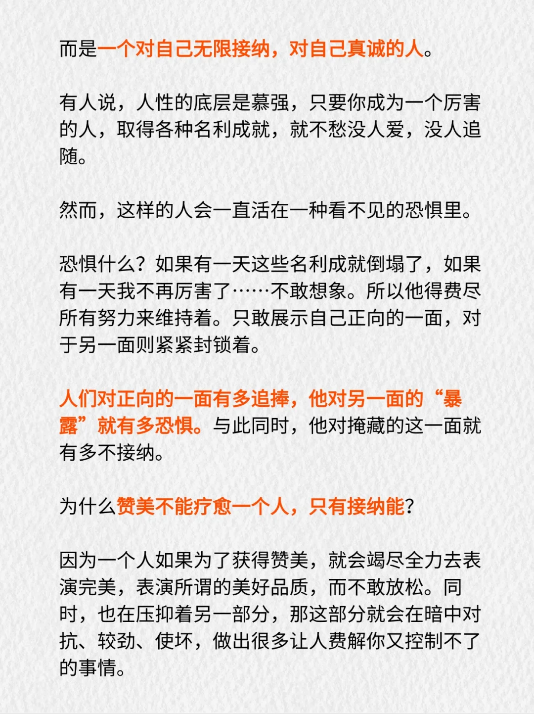 因为一个人如果为了获得赞美,就会竭尽全力去表演完美,表演所谓的美好品质,而不敢放松。同时,也在压抑着另一部分,那这部分就会在暗中对抗、较劲、使坏,做出很多让人费解你又控制不了的事情。