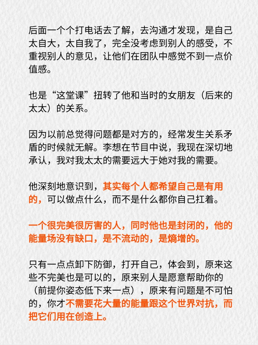 也是“这堂课”扭转了他和当时的女朋友的关系。因为以前总觉得问题都是对方的,经常发生关系矛盾的时候就无解。李想在节目中说,我现在深切地承认,我对我太太的需要远大于她对我的需要。
