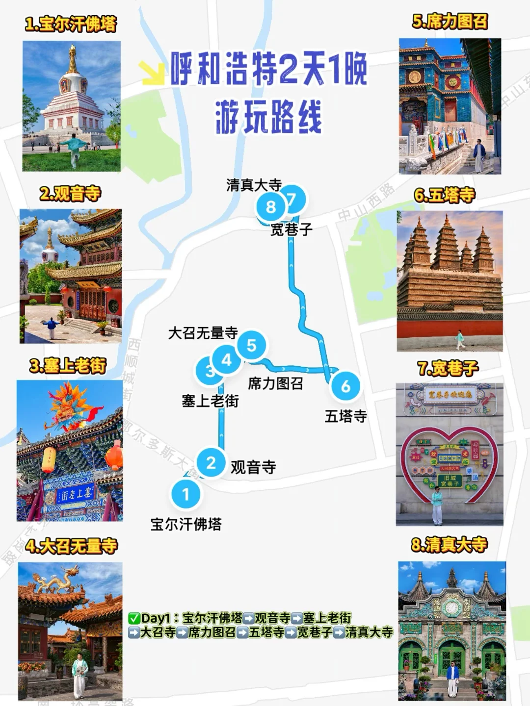 ✅Day1:宝尔汗佛塔➡️观音寺➡️塞上老街➡️大召寺➡️席力图召➡️五塔寺➡️宽巷子➡️清真大寺