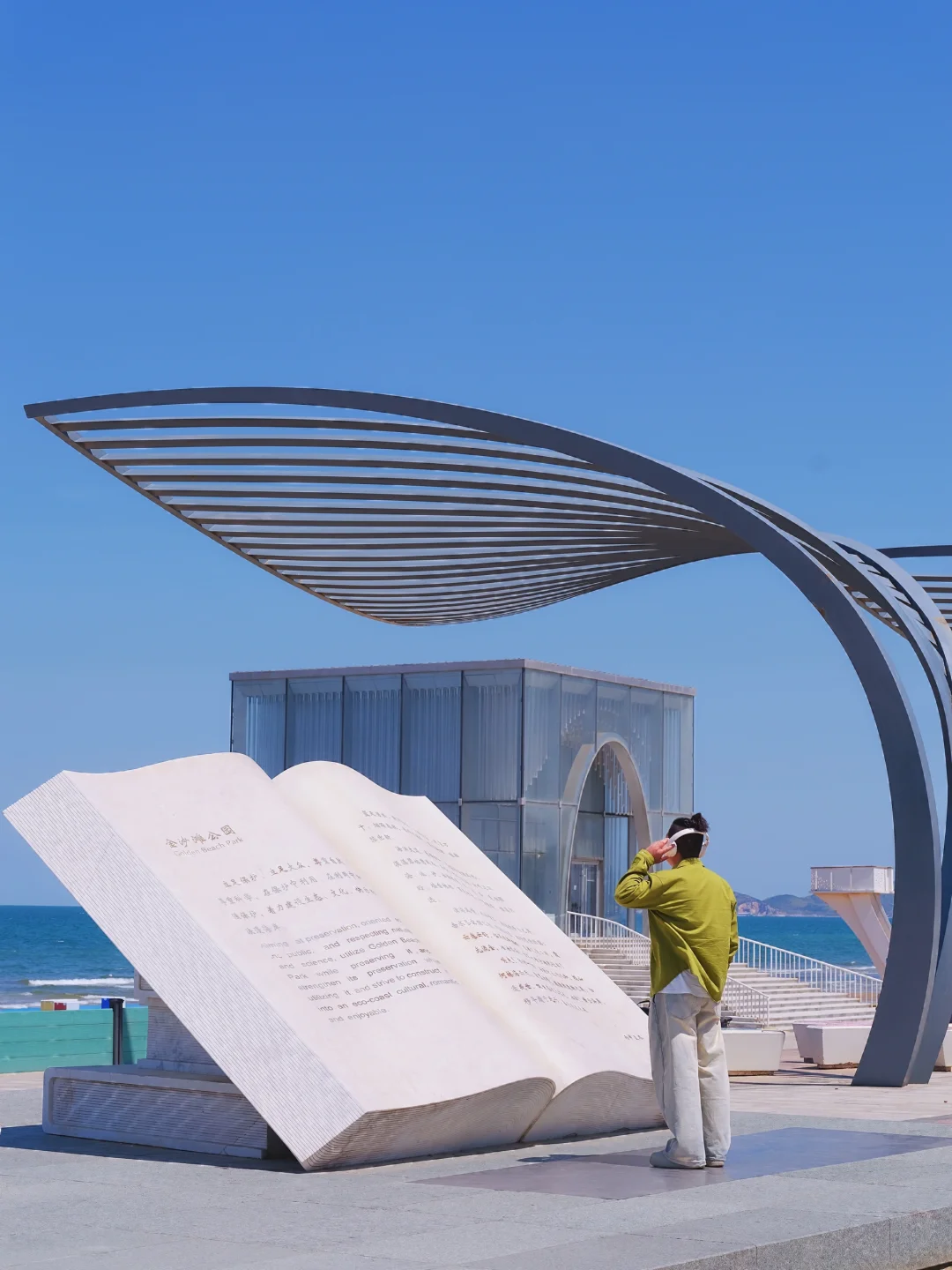 沙滩上白色教堂和旁边有一本超级大的书