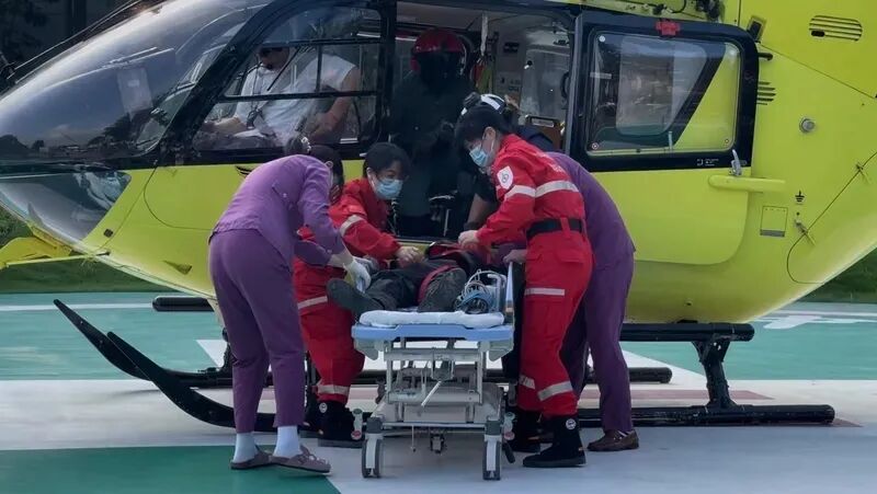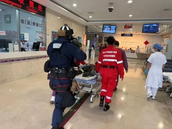 深圳市急救中心120指挥调度平台接到报警后,发现周围地理环境复杂,常规救护车无法到达,于是根据现场和患者情况迅速进行医疗研判,并紧急协调航空救援队,决定启动航空救援。整个救援过程紧凑有序,从患者进机舱到送达医院,仅用了10分钟。