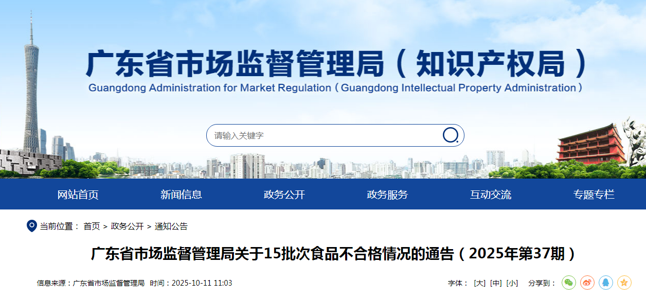 广东省市场监督管理局关于15批次食品不合格情况的通告(2025年第37期)