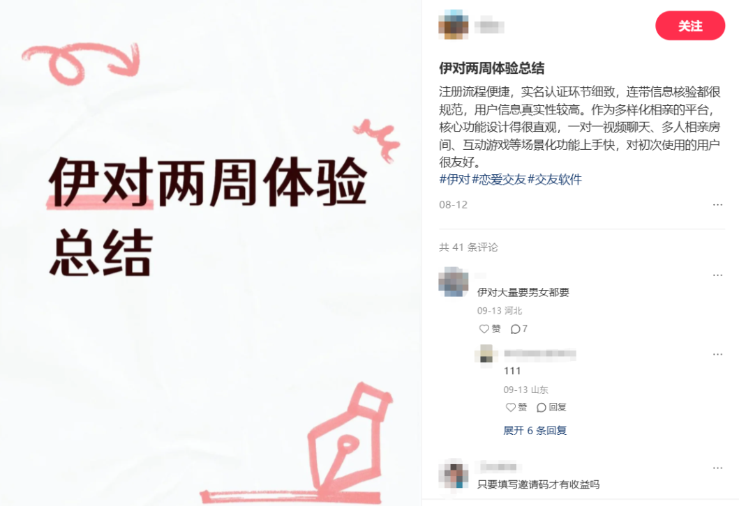 “伊对大量要,男女都要(指‘账号’)”“49b***(注:邀请码),流量超级好”“收伊对,不用实名,注册满三天就行”……在小红书平台上,检索关键词“伊对”,不少推文基本都会出现这些评论。