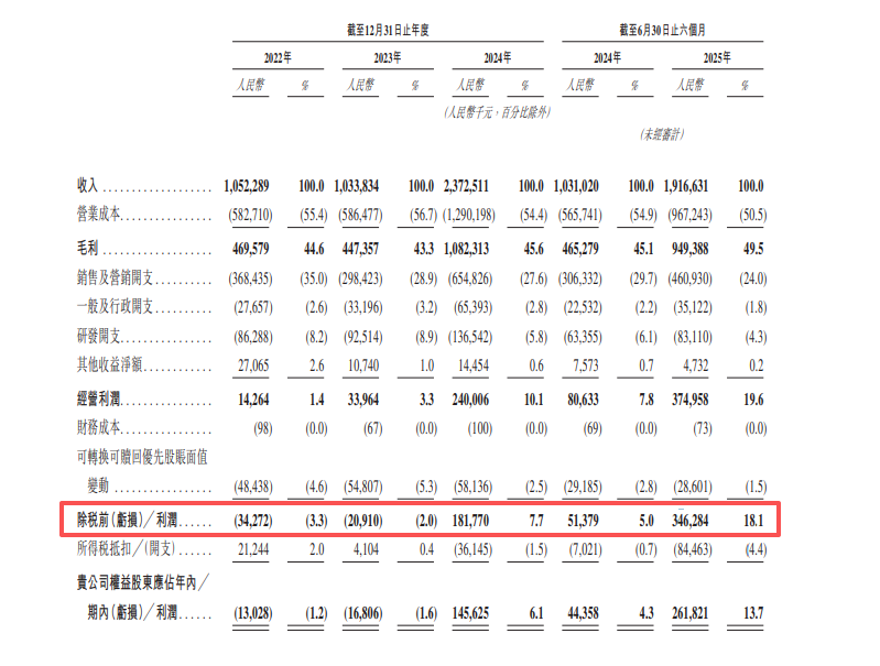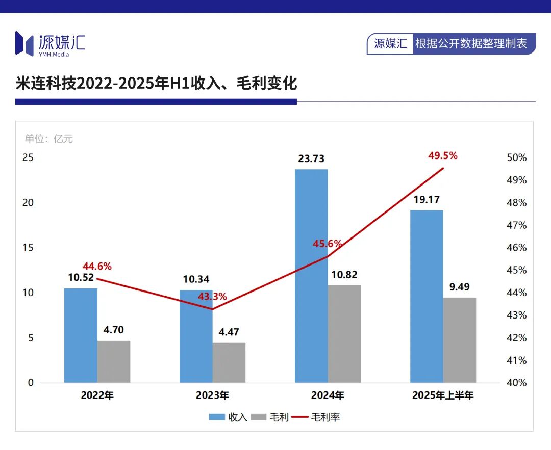 招股书显示,米连科技的收入,从2022年的10.5亿元飙升到2024年的23.7亿元,2025年上半年实现收入19.2亿元;毛利则从2022年的4.7亿元上涨至2024年的10.8亿元,2025年上半年为9.5亿元。