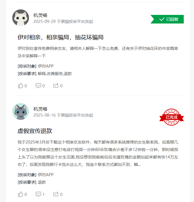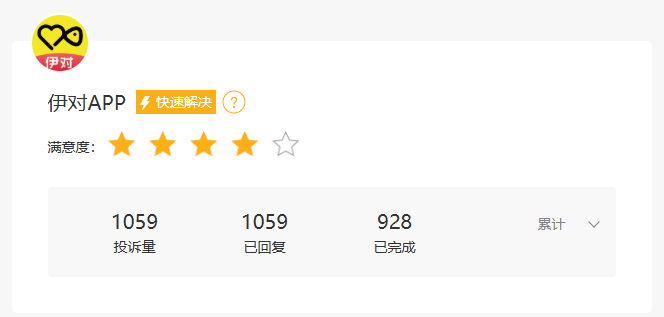 截至源媒汇发稿,在黑猫投诉平台上,伊对App累计有1059条投诉,其中不少用户投诉伊对“相亲骗局”“虚假宣传”“诱导老年人消费”等,而不少投诉对象均为男性用户。