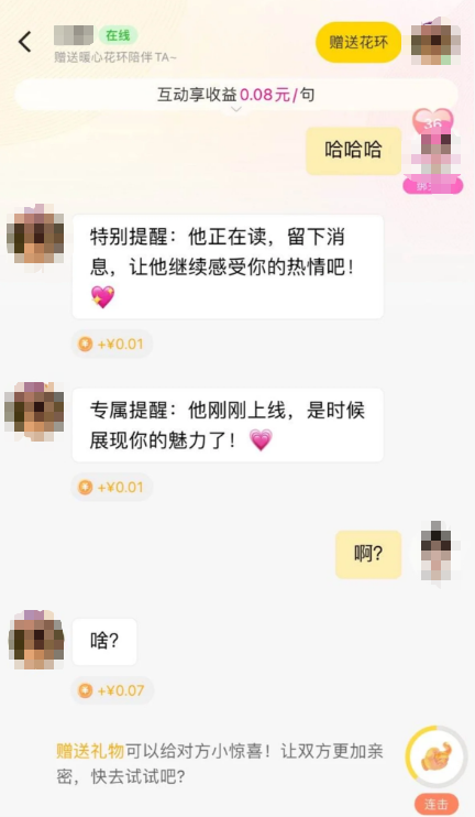 看似情感交友、婚恋牵线,但每个环节都离不开“钱”——聊天收费、语音按分钟计费、视频聊天需要充值购买虚拟礼物;同时,为了让用户保持日常活跃,平台按活跃度进行流量推送,以及给予聊天奖励金。