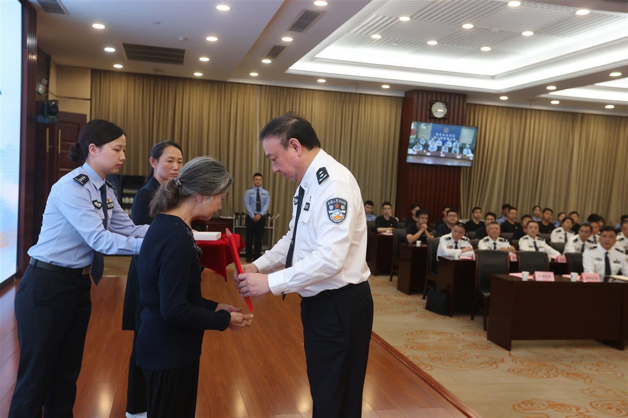 仪式现场庄重肃穆,武汉市公安局党委委员、政治部主任陈孝海宣读了人力资源社会保障部、公安部《关于追授纪汉等同志“全国公安系统二级英雄模范”称号的决定》。随后,该局党委副书记、副局长刘南华缓步走到纪汉同志遗属身边,将二级英模证书和奖章郑重地送到遗属手中。这份沉甸甸的荣誉,既是对纪汉同志一生奉献的肯定,也承载着对英雄的深切缅怀。