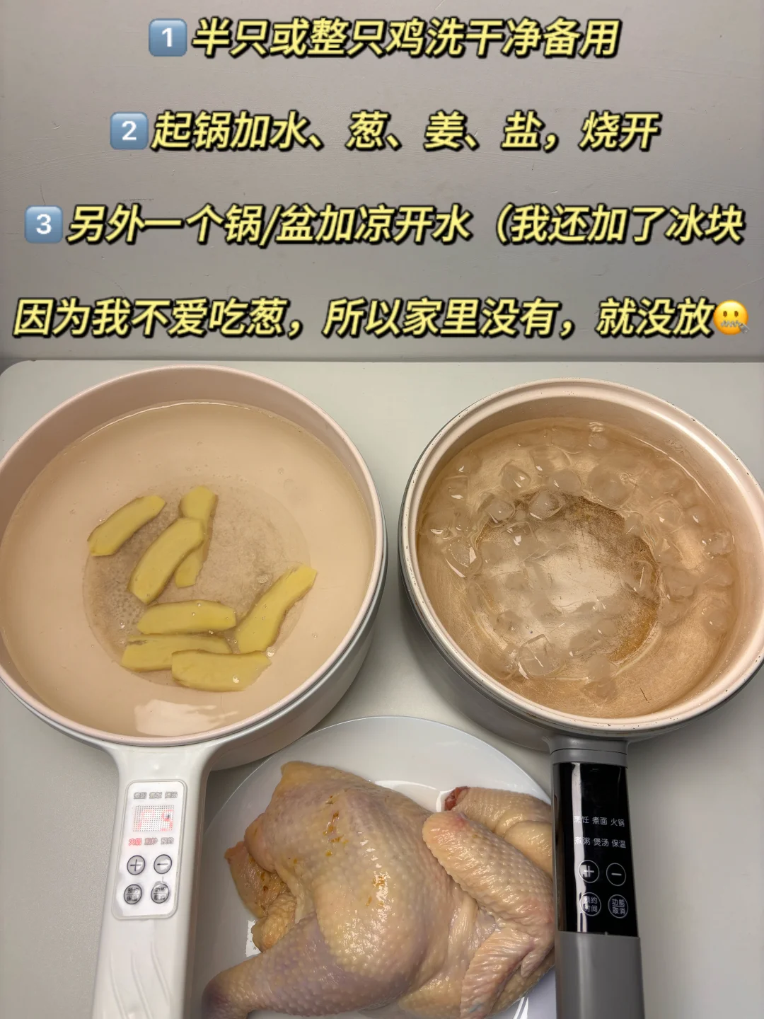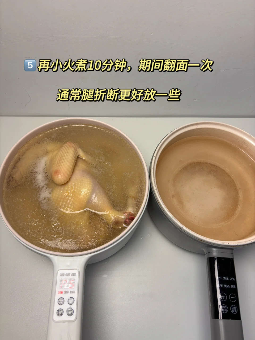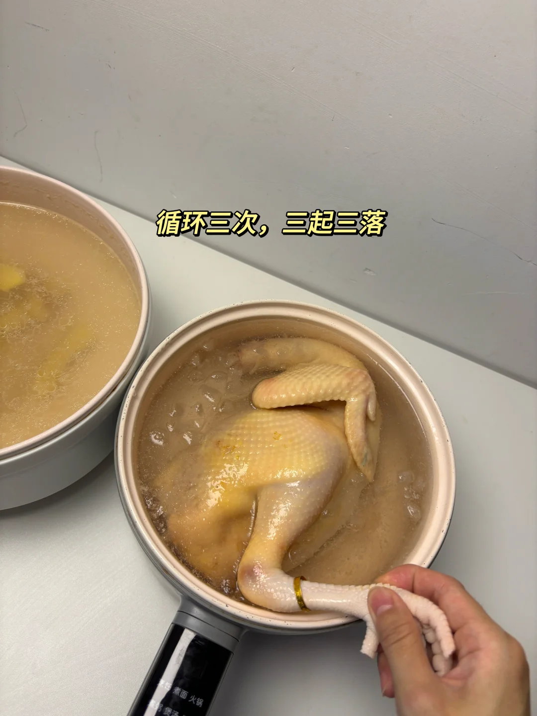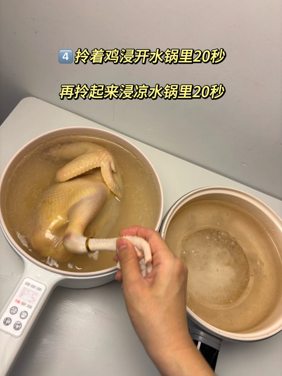 4️⃣拎着鸡浸开水锅里20秒,再拎起来浸凉水锅里20秒,循环三次,三起三落