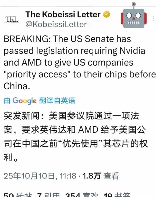 美国参议院10月10日通过立法,要求英伟达和AMD予以美国公司在中国之前“优先”使用其芯片的权利。 好笑。在中国公布新的稀土物项出口管制决定后,英伟达和AMD还能生产出美国公司可以在中国之前使用的芯片吗?