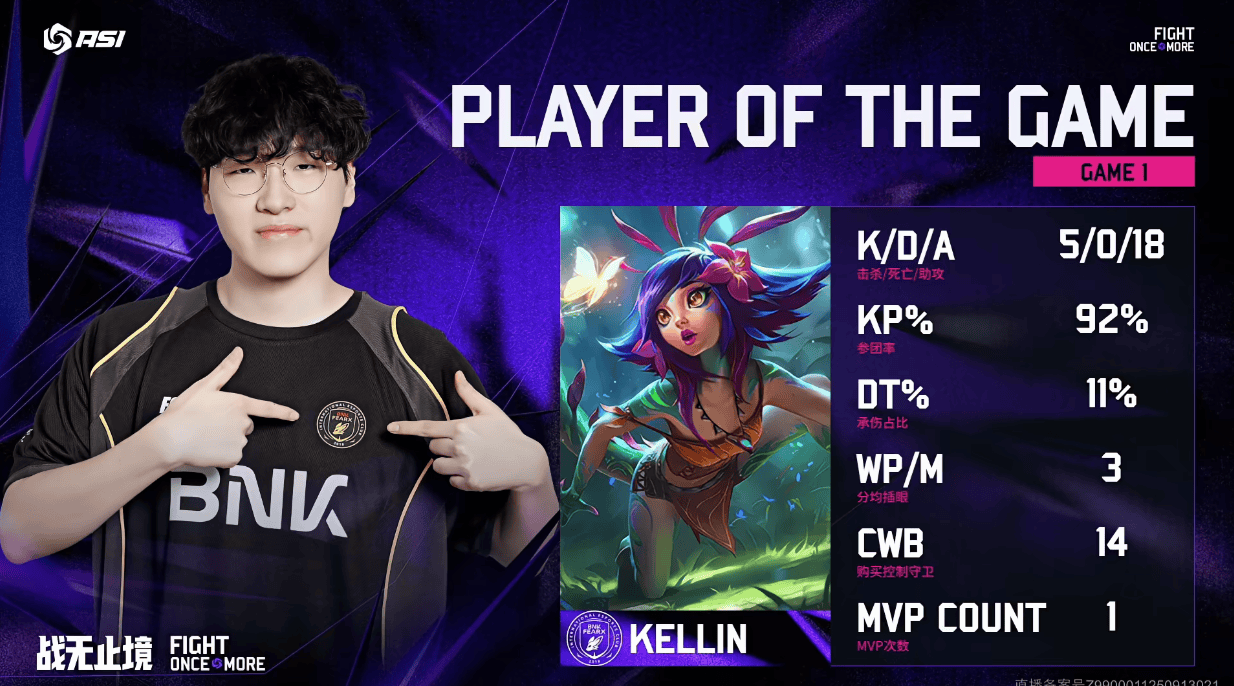 Kellin妮蔻打出5/0/18战绩,斩获BFX对阵NS第一局MVP