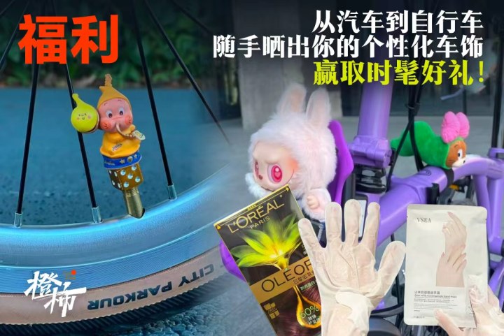 活动参与方式:带#车饰随手拍#的标签,来橙友圈#时髦经#话题下发帖,晒出你爱车的装饰品,可以是汽车里的挂饰安全带上的配饰、也可以是自行车上的气门芯配件、杯袋、篮筐架等等。