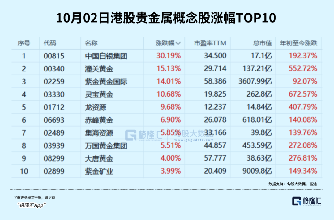 10月2日,港股国庆假期开市首日,贵金属概念全线大涨,板块中多只黄金股涨幅超10%,其中中国白银集团更是大涨30%,创出近4年新高。