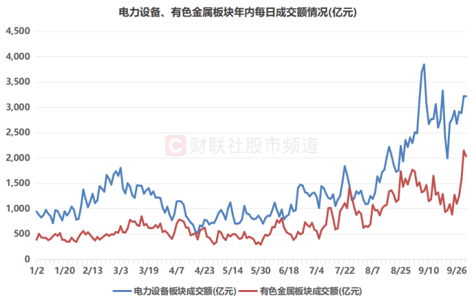 注:电力设备、有色金属板块年内每日成交额情况(截至10月10日收盘)