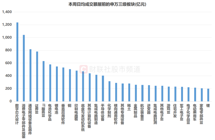 若从细分板块(申万三级)来看,同样以周内日均成交额统计,数字芯片设计、消费电子零部件及组装、通信网络设备及器件、证券Ⅲ、IT服务Ⅲ、电池化学品、锂电池、垂直应用软件、铜、印制电路板板块位列前十名。其中,数字芯片设计、消费电子零部件及组装两大细分板块日均成交额唯二超1000亿元。
