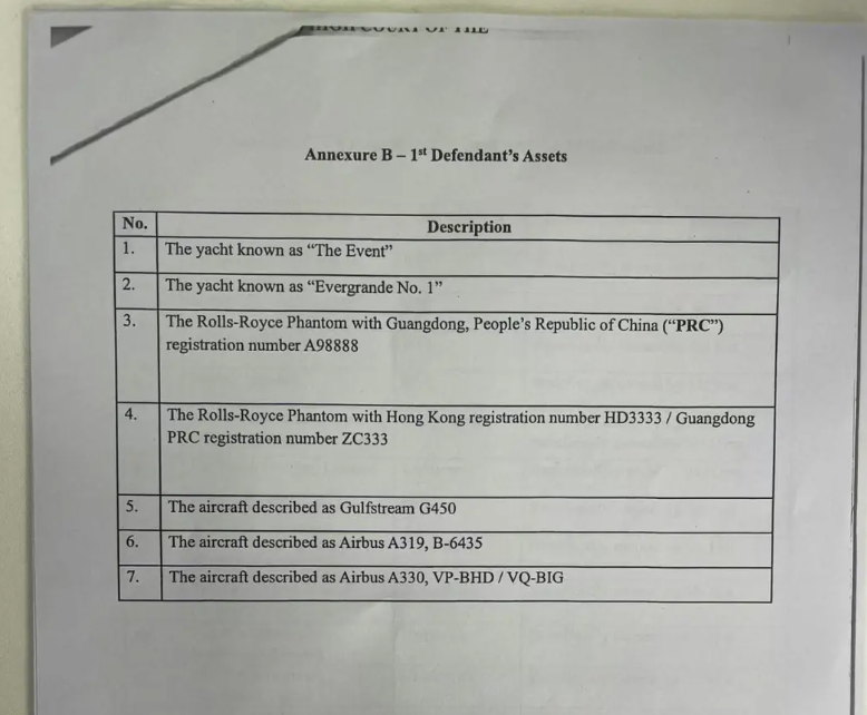 具体来看,中国恒大的清盘人接管的许家印资产包括位于中国香港、英国、美国的多处物业,还有私人飞机、豪车、游艇等,如两辆劳斯莱斯幻影,车牌分别为中国内地车牌粤A98888、中国香港车牌HD3333,3333是此前中国恒大的股票代码。