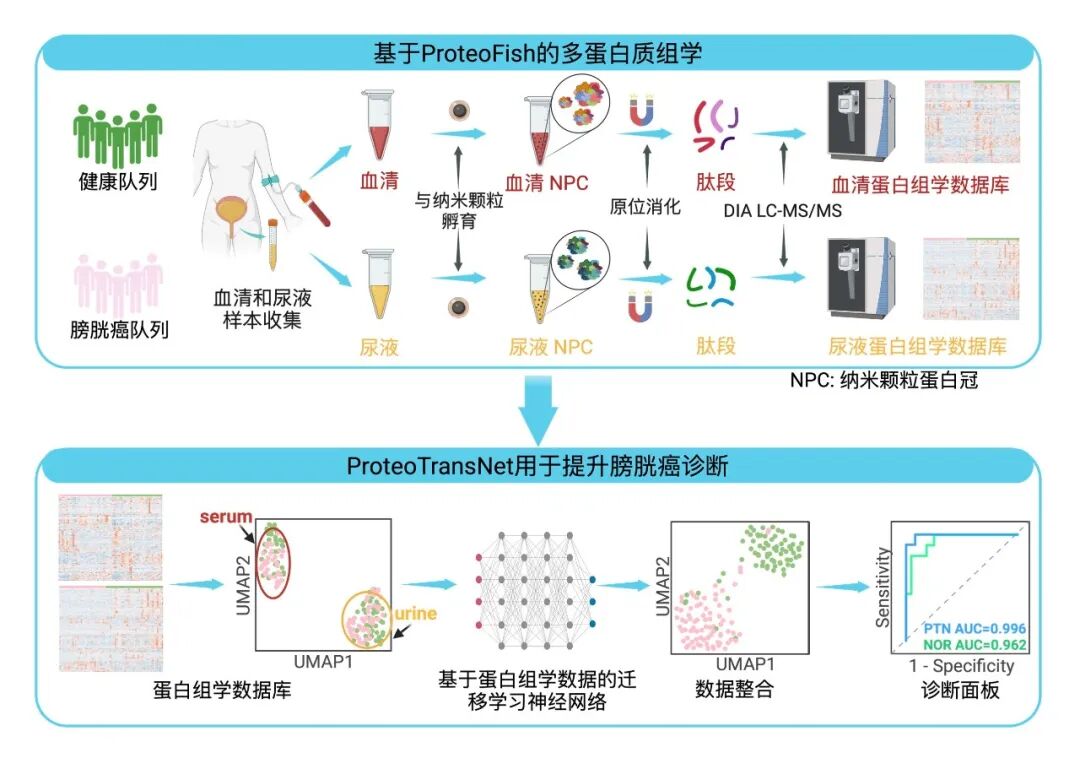 同时,在自主研发的蛋白质组迁移学习算法(ProteoTransNet)助力下,尿液与血清两类蛋白质组之间实现膀胱癌相关蛋白信息迁移。