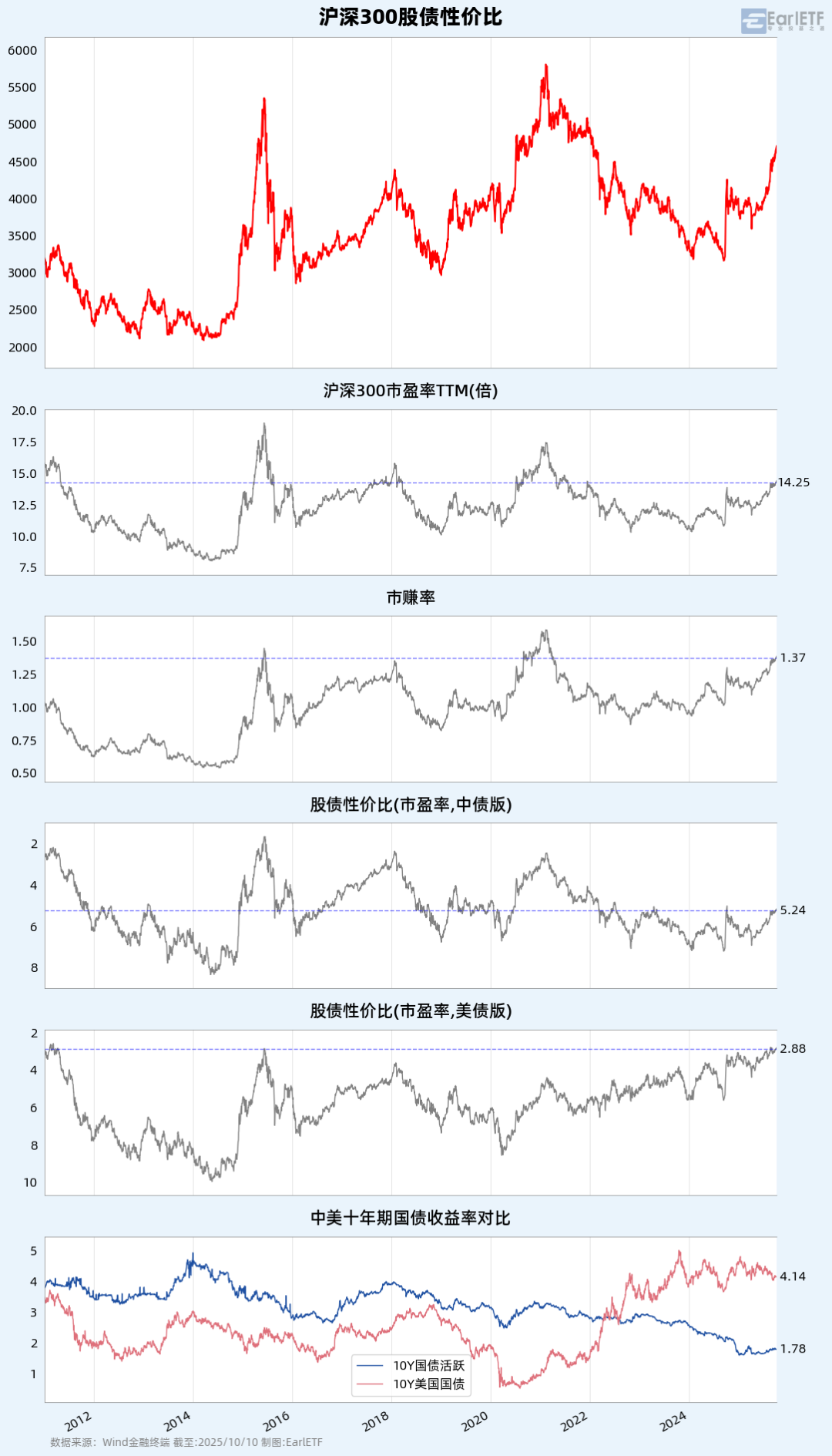 相对而言,A股中的高息红利股、小盘股,往往由内资主导定价,中国10年期股债引申的股债性价比更具参考价值。
