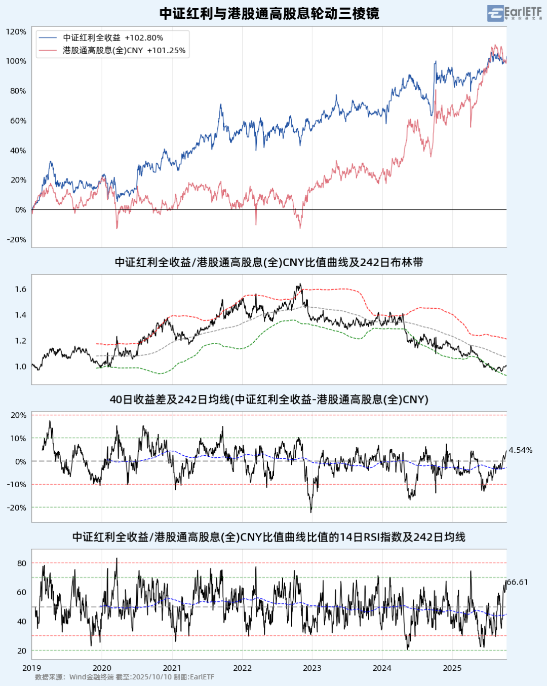 下图是中证红利相对中证港股通高股息指数(CNY)的轮动三棱镜,请密切注意40日收益差,过高时可以多买点港股高股息,过低时则要多多考虑中证红利。
