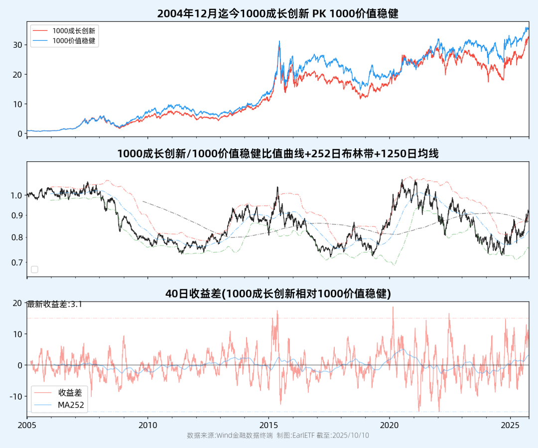 当然,不是所有的品种之间,都适合用这样的趋势思路去看待,比如1000成长创新和1000价值稳健明显比值就在一个区间内震荡,看着比值低买高卖或许更好。