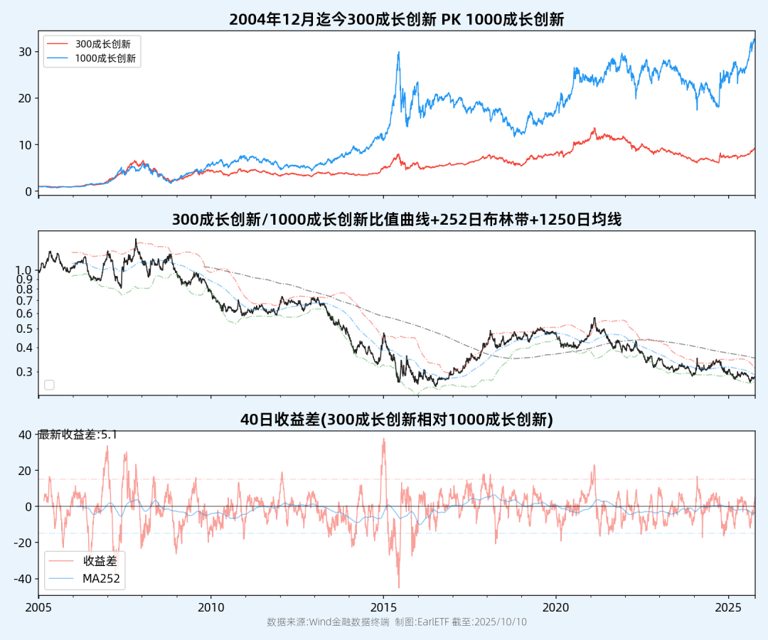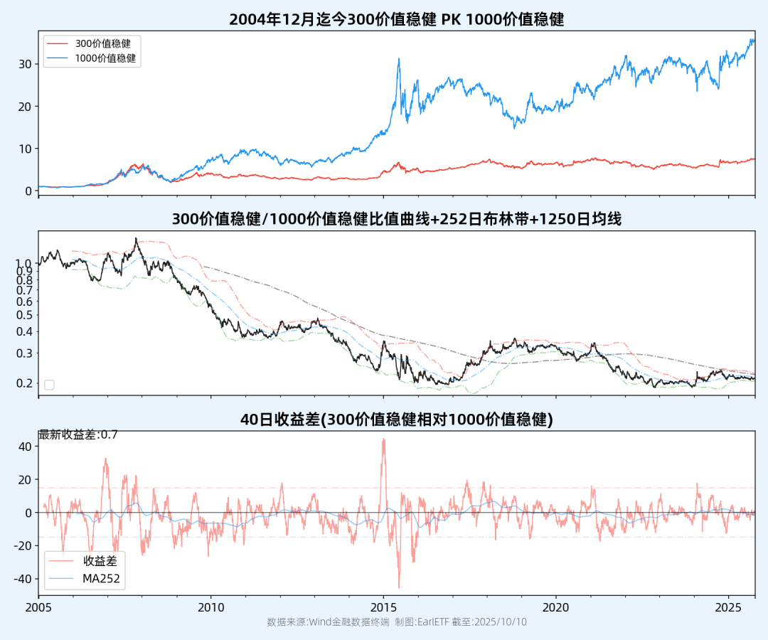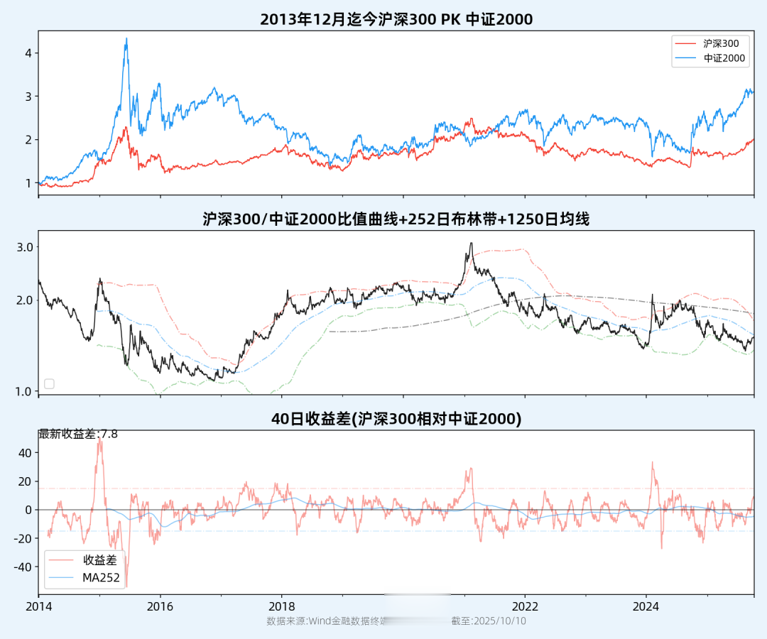 正如我在上文中说到的,当比值上穿或下穿252日布林线,或者比值跌破五年均线,又或者是40日收益差252日均线上下穿0值这三个信号凑齐两个的时候,你就要对一波轮动开始的可能,高度重视了。