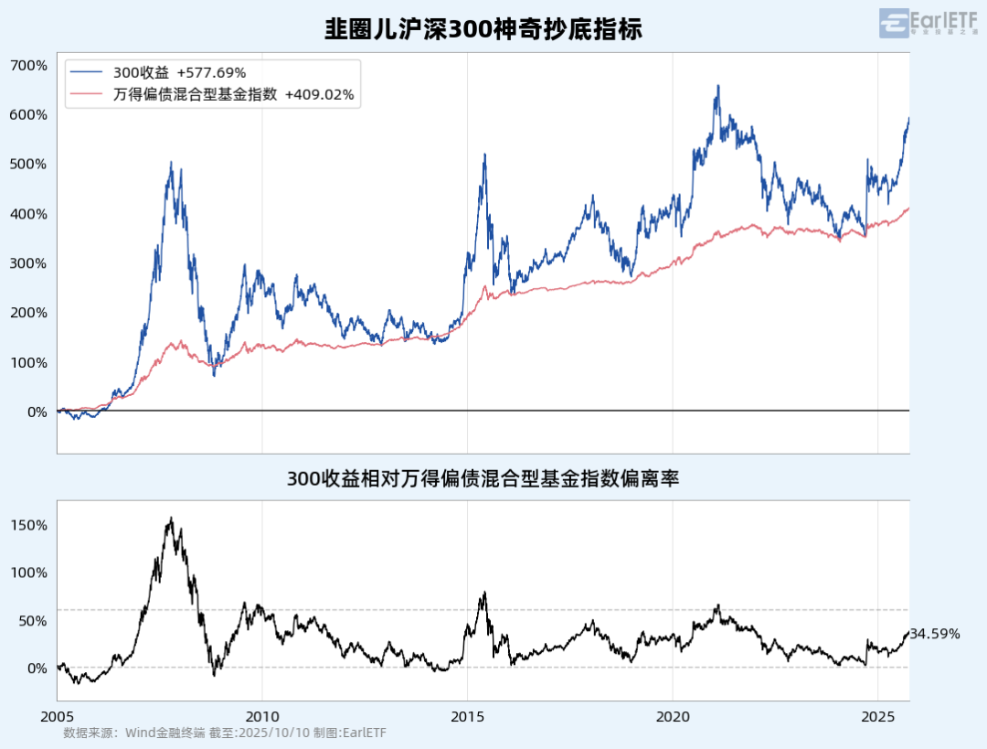 之前推送过一篇《韭圈儿的神奇沪深300抄底指标,还能怎么用》,介绍了韭圈儿提出的用万得偏债混合型基金指数来作为沪深300全收益指数底部预测的一个神奇发现,我进一步推演了作为顶部的预测功能。许多读者觉得这东西太神奇了,建议每周跟踪。
