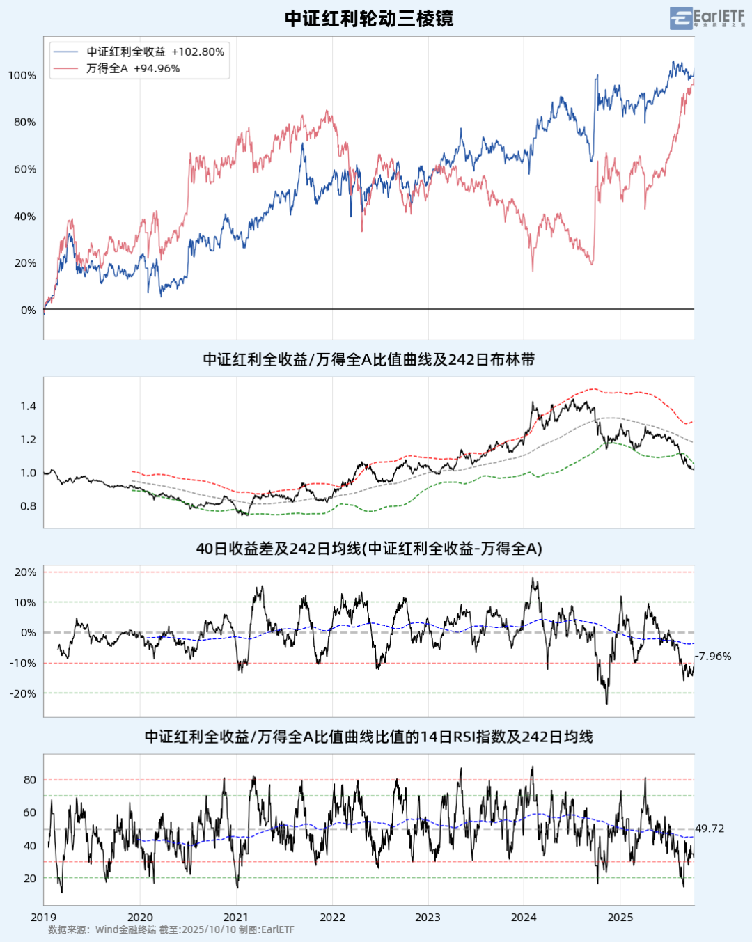 下图是中证红利相对Wind全A的轮动三棱镜,请密切注意40日收益差,过高的时候不要追高,可以静待回落到零轴甚至此前常见的更低点时杀入。