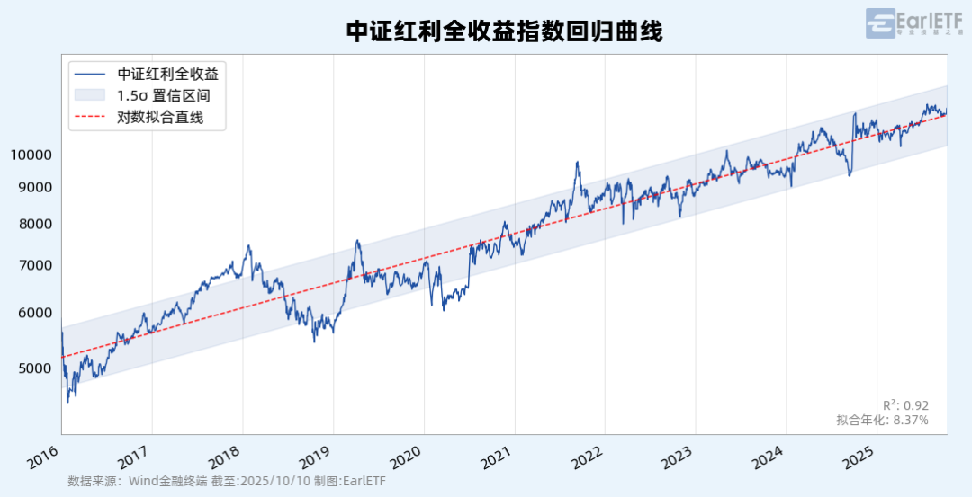 下图是中证红利全收益指数自2016年以来的对数回归曲线,并叠加了1.5个标准差的置信区间。