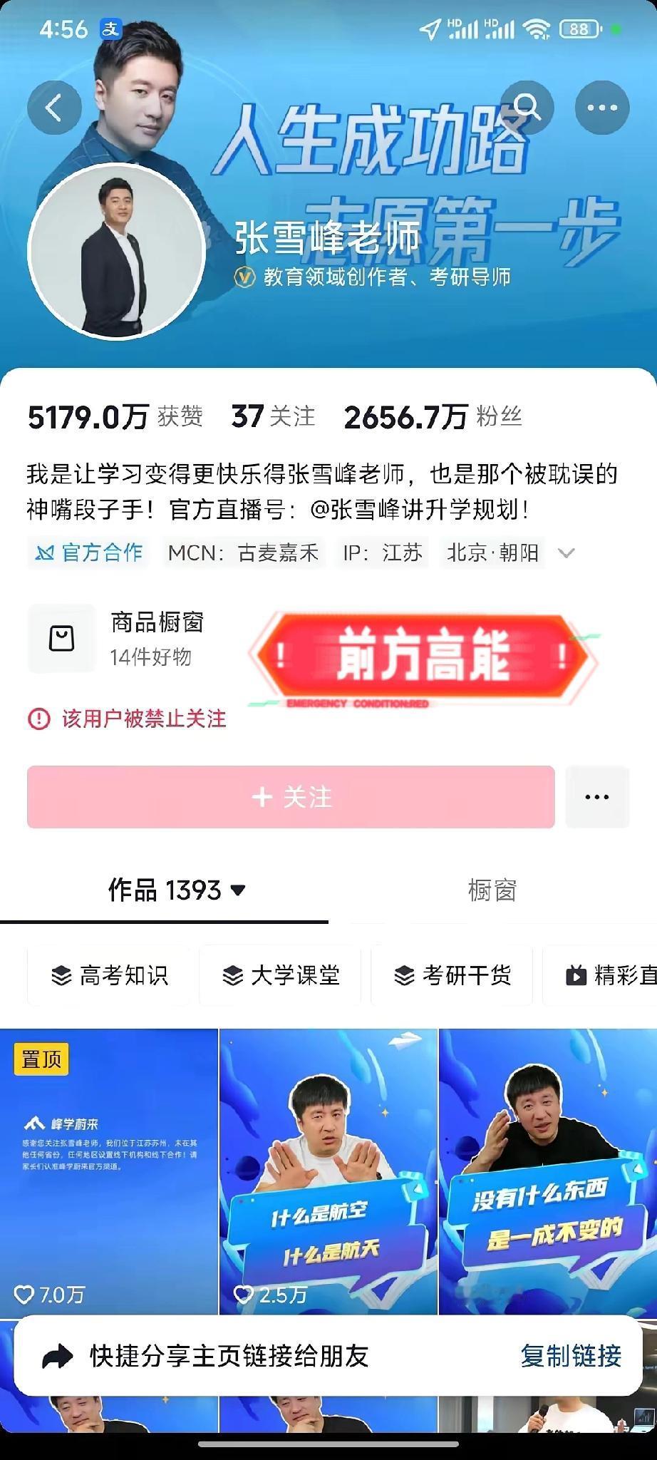 最近不少人说张雪峰被封了 我特地去看了下 发现他的账号还在,只是 显示“该用户被禁止关注”。这和完全封号不一样,更像是被限制了部分功能。 我觉得这其实是平台的一种“降温”处理——既让他的影响力暂时受限,又不至于完全消失! 毕竟他说话太直白,动了不少人的利益,但同时也帮了很多学生找到方向。这种“禁关注”状态可能是短期的,也可能是长期的,关键看他后续的内容风格会不会调整! 我个人还是挺欣赏他的,敢说真话的人不多了。你觉得,这种“禁关注”算是平台的警告,还是一种变相的保护?