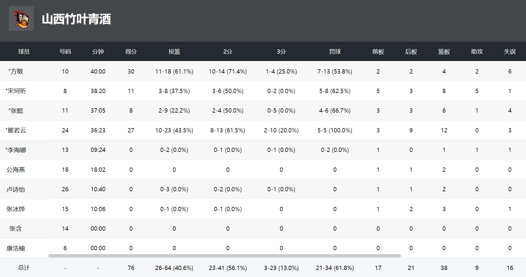 山西女篮:方敏30分4板2助,翟若云27分12板,张懿8分6板。