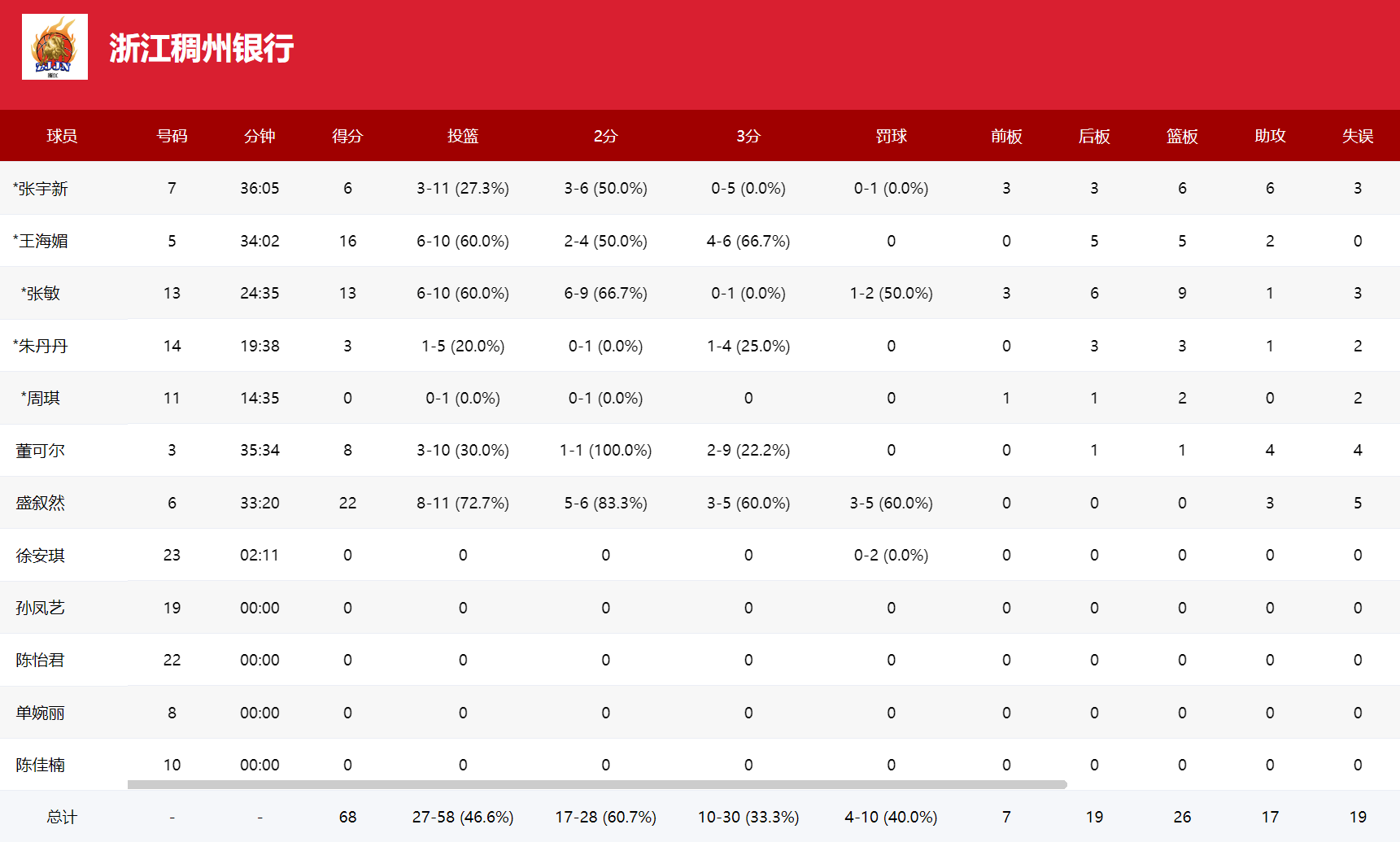浙江女篮:盛叙然22分3助,王海媚16分5板,张敏13分9板。