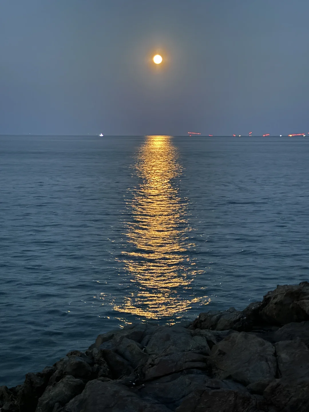 在日落后,走海边栈道,会看到月亮像个熟透流心的咸蛋黄