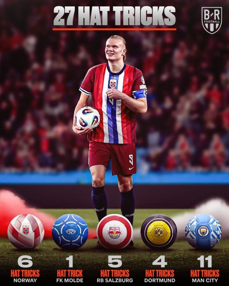 直播吧10月12日讯世预赛欧洲区比赛,哈兰德打进3球,帮助挪威主场5-0大胜以色列。据brfootball统计,哈兰德职业生涯至今已经27次戴帽(包括进球超过3粒)。