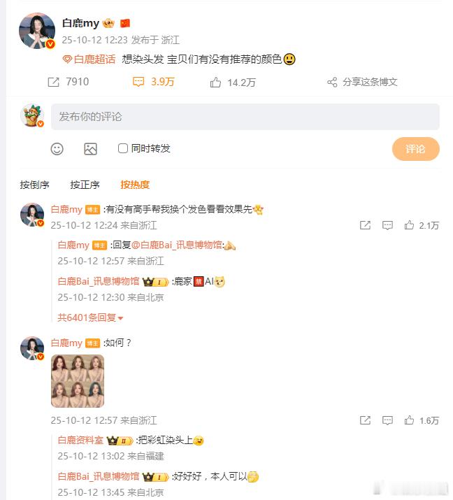 白鹿用上AI了白鹿主打一个叛逆啊,让粉丝帮忙换个发色看看效果,粉丝回复:鹿家🈲AI,不一会儿,白鹿就亲自动手了,哈哈哈哈哈,粉丝一句:本人可以,也是没辙了,能怎么办,宠着呗[笑cry][笑cry][笑cry]