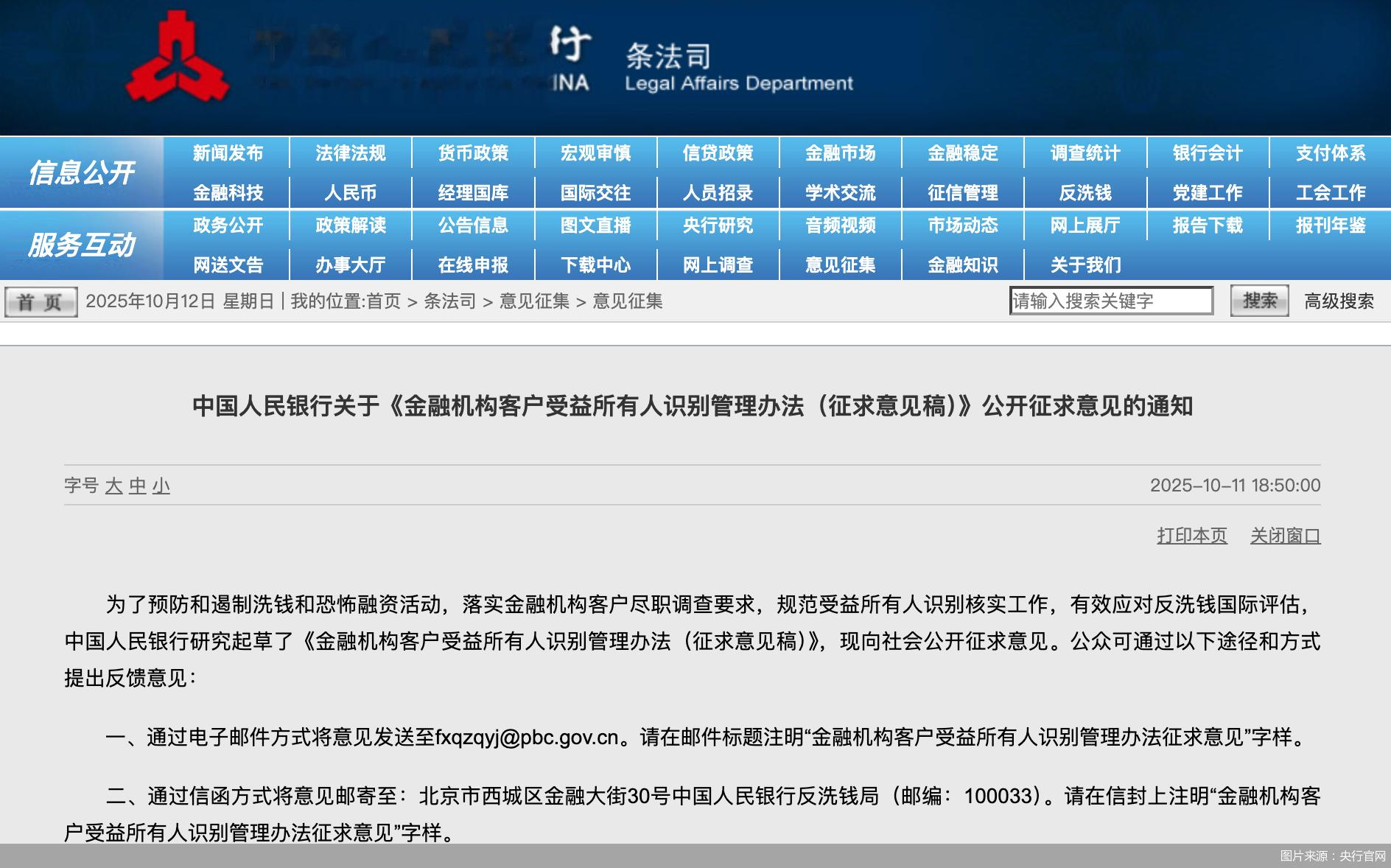 北京商报讯(记者刘四红)事关金融机构反洗钱,央行正酝酿新规。据央行官网,10月11日,央行就《金融机构客户受益所有人识别管理办法》(以下简称《办法》)征求意见,此举主要为贯彻落实新修订的《中华人民共和国反洗钱法》(以下简称《反洗钱法》)相关要求,规范受益所有人识别核实工作,有效应对反洗钱国际评估,也是提升金融机构受益所有人工作有效性的需要。