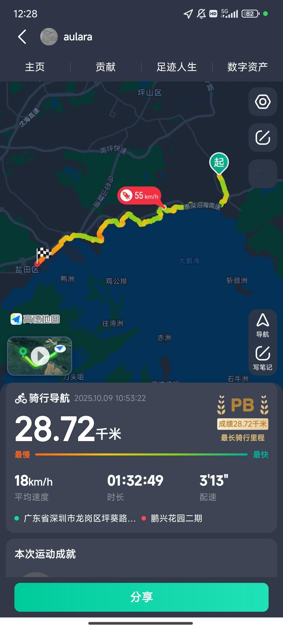从龙华骑车去大鹏是啥感觉?[可爱] 从G94梅观路下皇岗路,皇岗左转北环,北环接沿河路,沿河路左转罗沙路[笑] 罗沙路接梧桐山盘山公路,盘山公路下来沙盐路[呲牙] 到了盐田海鲜街上盐葵路,一路山路经大小梅沙到葵涌。最后是经葵鹏路下大鹏。单程65公里,全程130公里[大笑] 坚持下来了,回程山路还能保持18的均速!