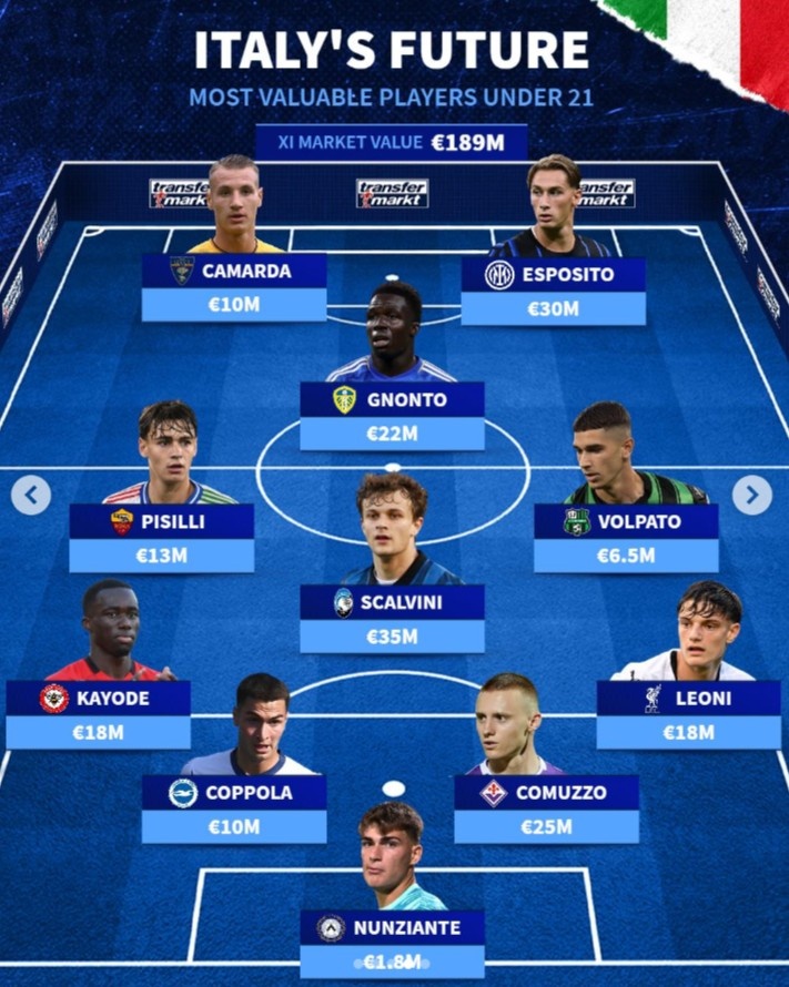 直播吧10月12日讯德转列出意大利U21最贵阵容,莱奥尼、皮奥-埃斯波西托在列,11人总身价1.89亿欧。