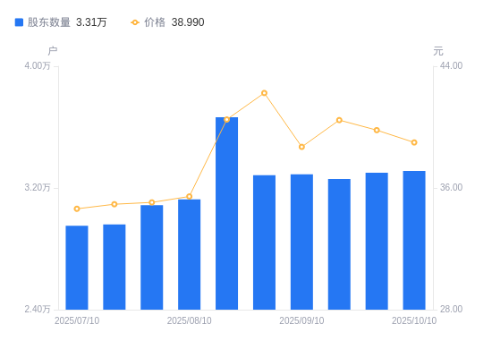 日期A股户数(户)流通A股户均持股数(股)户均持股市值(万元)2025-09-303300015798.3562.882025-09-193258615999.0664.732025-09-103289815847.3361.332025-08-293283815876.2867.062025-08-203664614226.5357.622025-08-103125416680.9259.122025-07-313086216892.8059.212025-07-182960217611.8361.522025-07-102951317664.9461.172025-06-302879318106.6762.65