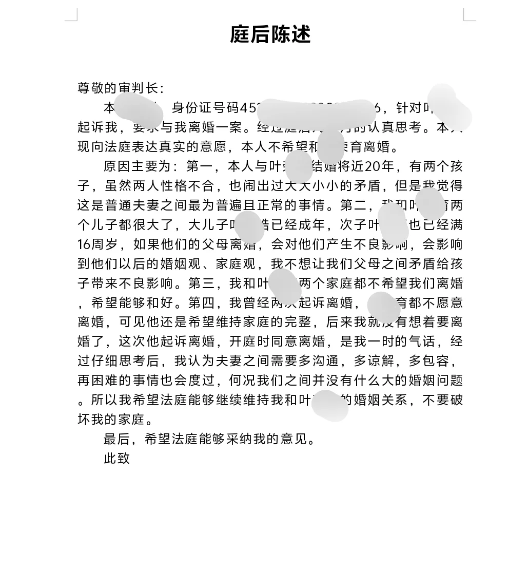 庭后我复盘案件后,在未与当事人沟通的情况下,草拟不同意离婚的《庭后陈述》,以当事人的口吻表达四点不同意离婚的理由,以真诚争取法官同意我方请求。最终法庭果然判决不同意离婚。