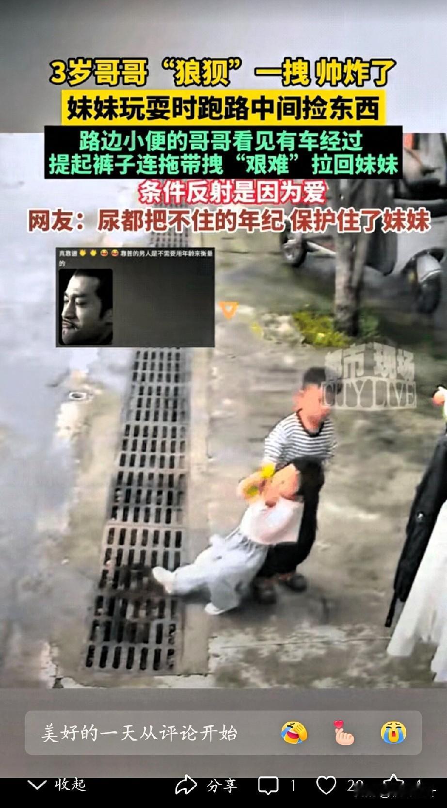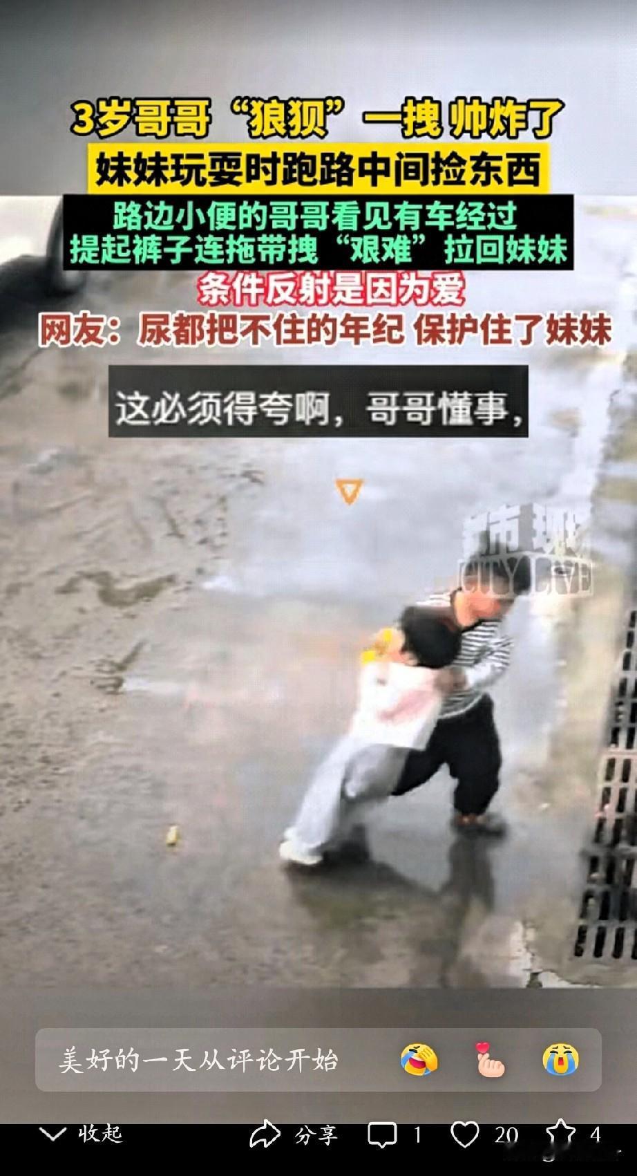万万没想到!安徽街头的监控画面,3岁小男孩正蹲在路边小解,刚尿到一半,突然瞥见身边的妹妹蹦蹦跳跳冲向马路中央,原来地上有个吸引她的小玩具。而不远处,一辆汽车正朝着这个方向快速驶来,喇叭声都清晰可闻。 这时候,让人揪心又感动的一幕发生了:男孩根本来不及多想,一手慌忙提起没拉好的裤子,另一只手像带着一股急劲儿,直接冲上去抓住妹妹的手腕,用尽全身力气把她往人行道上拽。也就是这短短两三秒,妹妹刚好避开了驶来的车辆,化险为夷。 后来家长看监控时,眼泪瞬间就下来了——平时连自己穿袜子都要大人帮忙的孩子,在危险面前竟成了妹妹最靠谱的“小靠山”。网友说得特别实在:“尿都控制不住的年纪,护妹妹的动作却比谁都果断!” 其实咱们养娃总在纠结,该怎么教他勇敢、有担当,可看完这一幕才懂,比起书本上的道理、刻意的引导,家人之间那份天然的在意与牵挂,才是孩子最珍贵的成长养分。他或许不懂“责任”的定义,却用最本能的动作,诠释了什么是“拼尽全力去守护”。 你们家孩子有没有做过类似的暖心小事?哪怕只是帮你递杯水、护着家里的小宠物,都值得被记住!