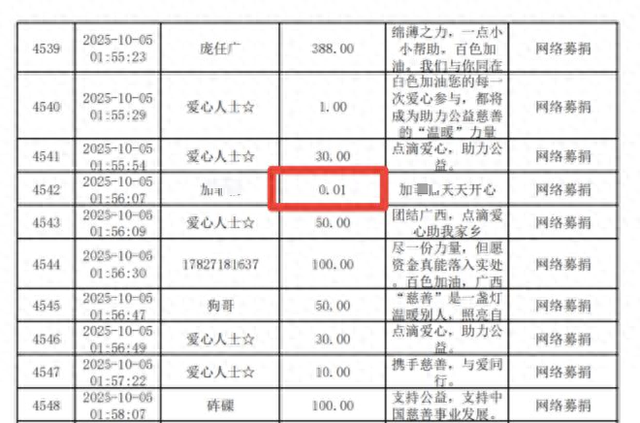 10月6日晚,百色市慈善总会在其官方公众号发布了《接收“洪灾救助”社会捐赠公示(第一期)》。公示表格显示,爱心人士的捐赠金额较为悬殊,有的高达10万元,有的只有1元,甚至有好几笔捐款的金额是0.01元。
