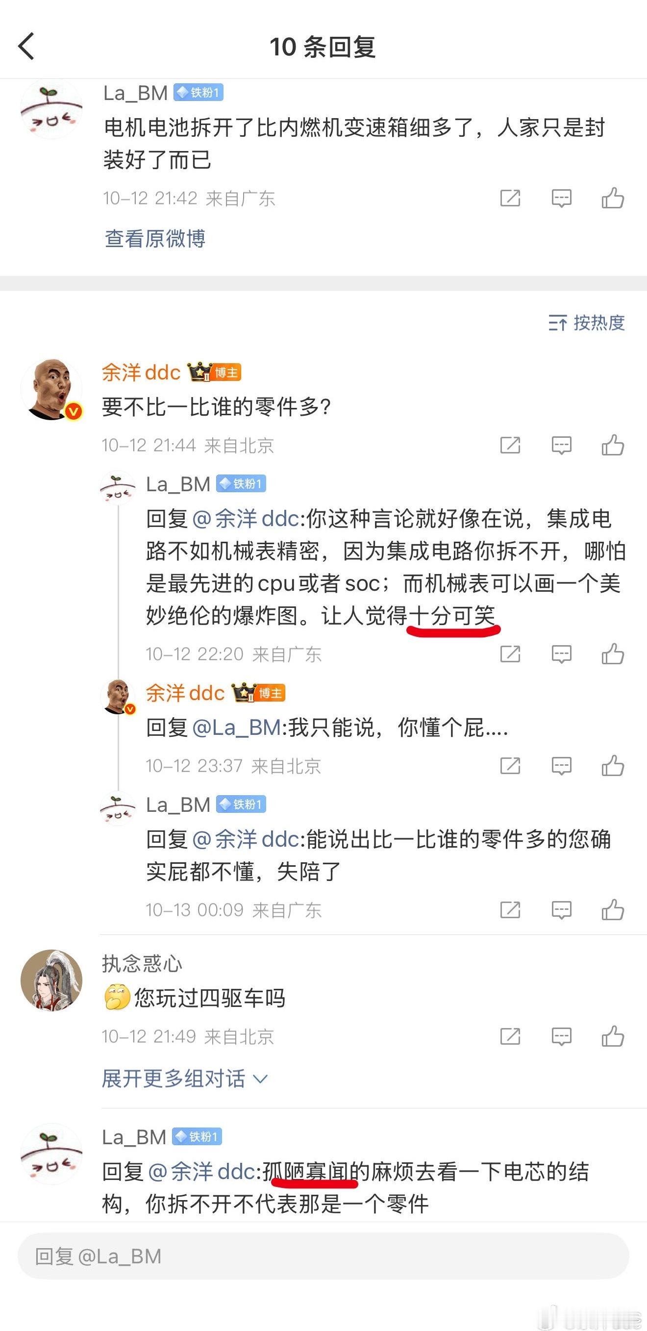 燃油车比电车零件多这个事难道还需要科普吗?然后这位网友给我说电机电池只是没拆而已…然后我回复他要不要比一下谁的零件多?结果说我又是孤陋寡闻,又是可笑…我回了懂个屁就破防…