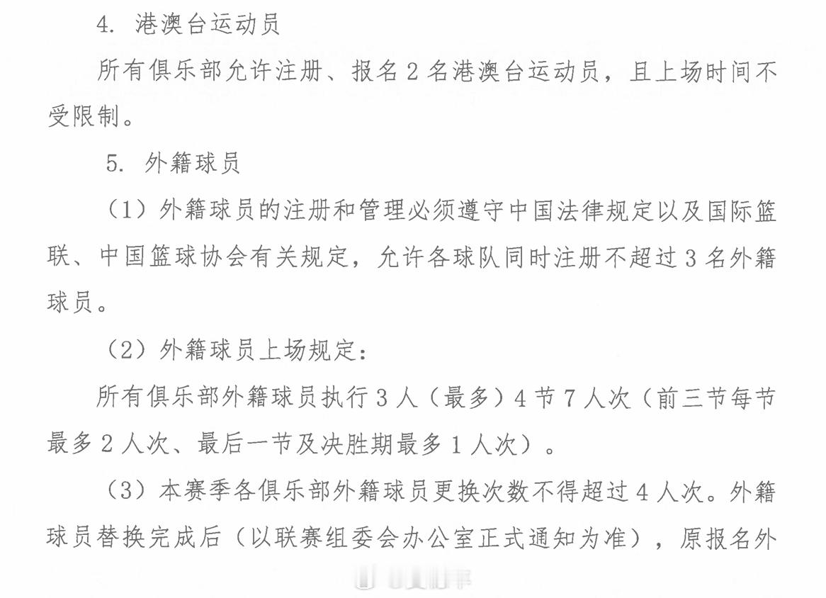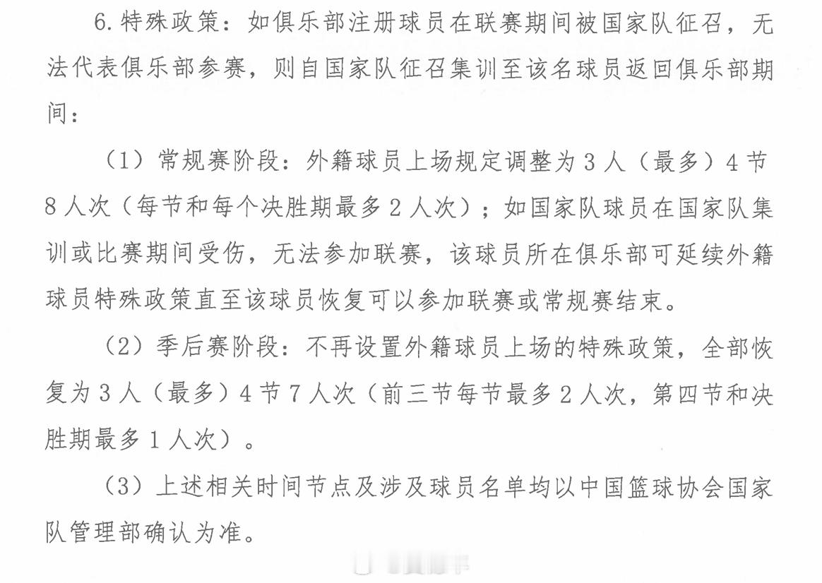 若在常规赛阶段出现队内的中国大陆球员被征调到国家队效力的情况,或者该球员在为国效力期间受伤导致无法出战联赛的比赛,则在征调或者养伤期间,该队的外援使用规则变为4节8人次,末节可用双外援。季后赛阶段,不再设置外援特殊使用规则,恢复4节7人次,末节单外援。