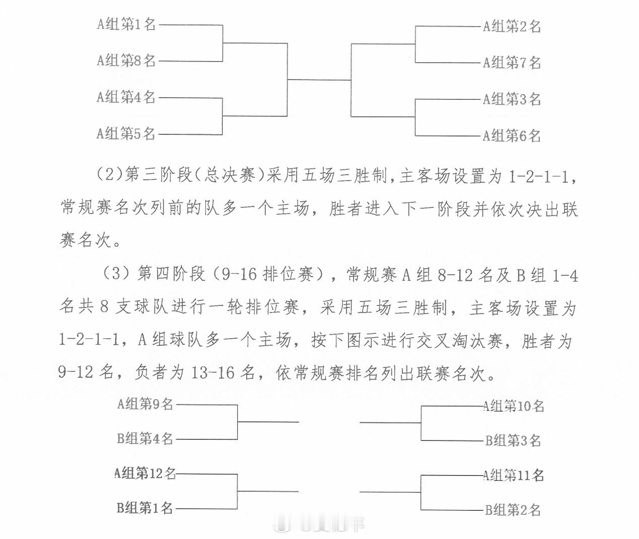 A组12支球队全部进入季后赛,B组前4名球队进入季后赛,合计16支季后赛球队。A组前8名参与争冠,8进4和半决赛均为三局两胜制,总决赛为五局三胜制。A组9到12名跟B组前4名参加排位赛,为五局三胜制。