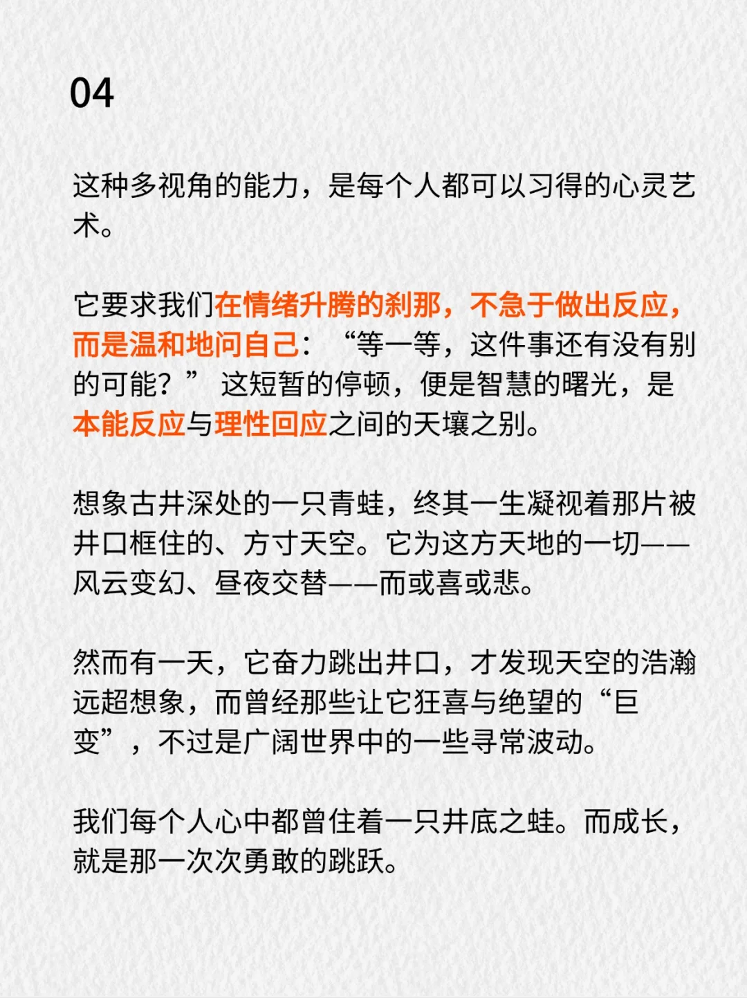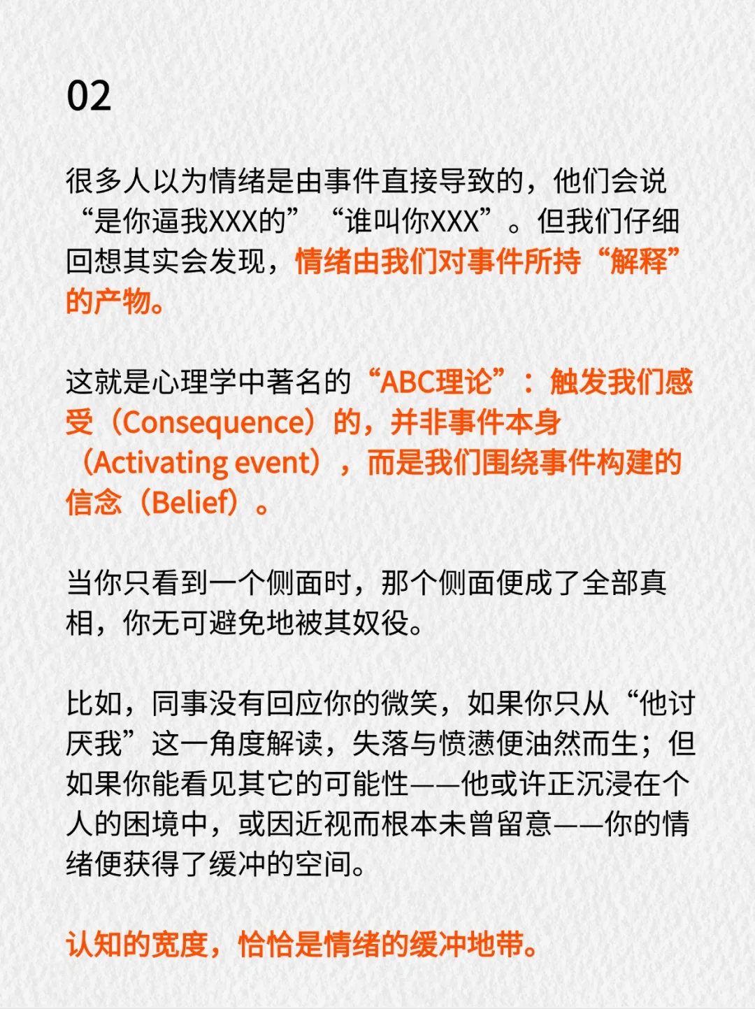 比如,同事没有回应你的微笑,如果你只从“他讨厌我”这一角度解读,失落与愤懑便油然而生;但如果你能看见其它的可能性——他或许正沉浸在个人的困境中,或因近视而根本未曾留意——你的情绪便获得了缓冲的空间。