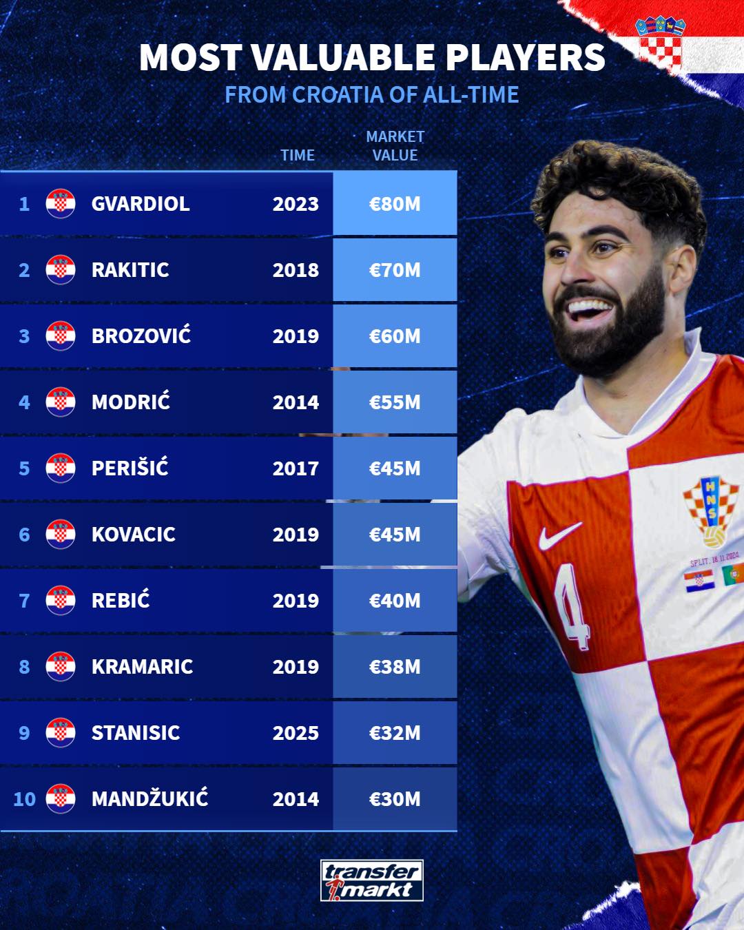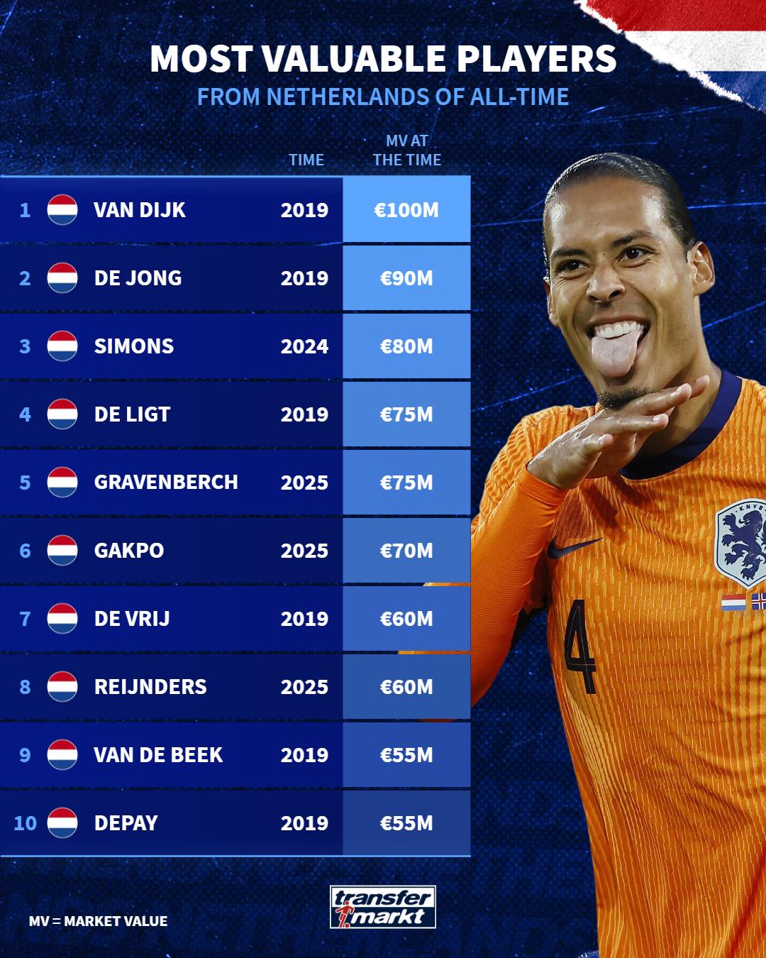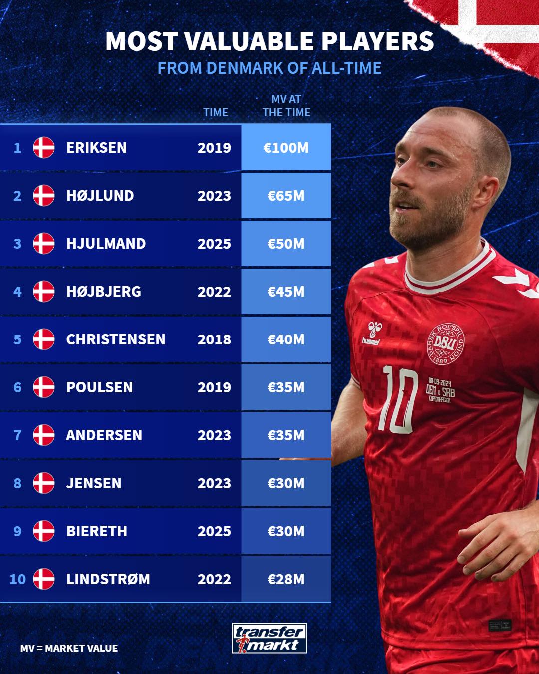 虎扑10月13日讯今天,德国转会市场盘点了5个国家(丹麦、荷兰、克罗地亚、埃及、加纳)历史上最高身价的球员。其中,两个非洲国家都已经锁定2026世界杯名额,三个欧洲国家则是在今天进行的世预赛中取胜,且在各自小组中位列榜首。